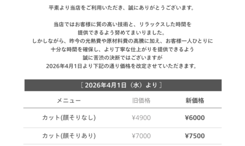 お客様各位 平素より当店をご利用いただき、誠にありがとうございます。 当店ではお客様に質の高い技術と、リラックスした時間を 提供できるよう努めてまいりました。 しかしながら、昨今の光熱費や原材料費の高騰に加え、お客様一人…